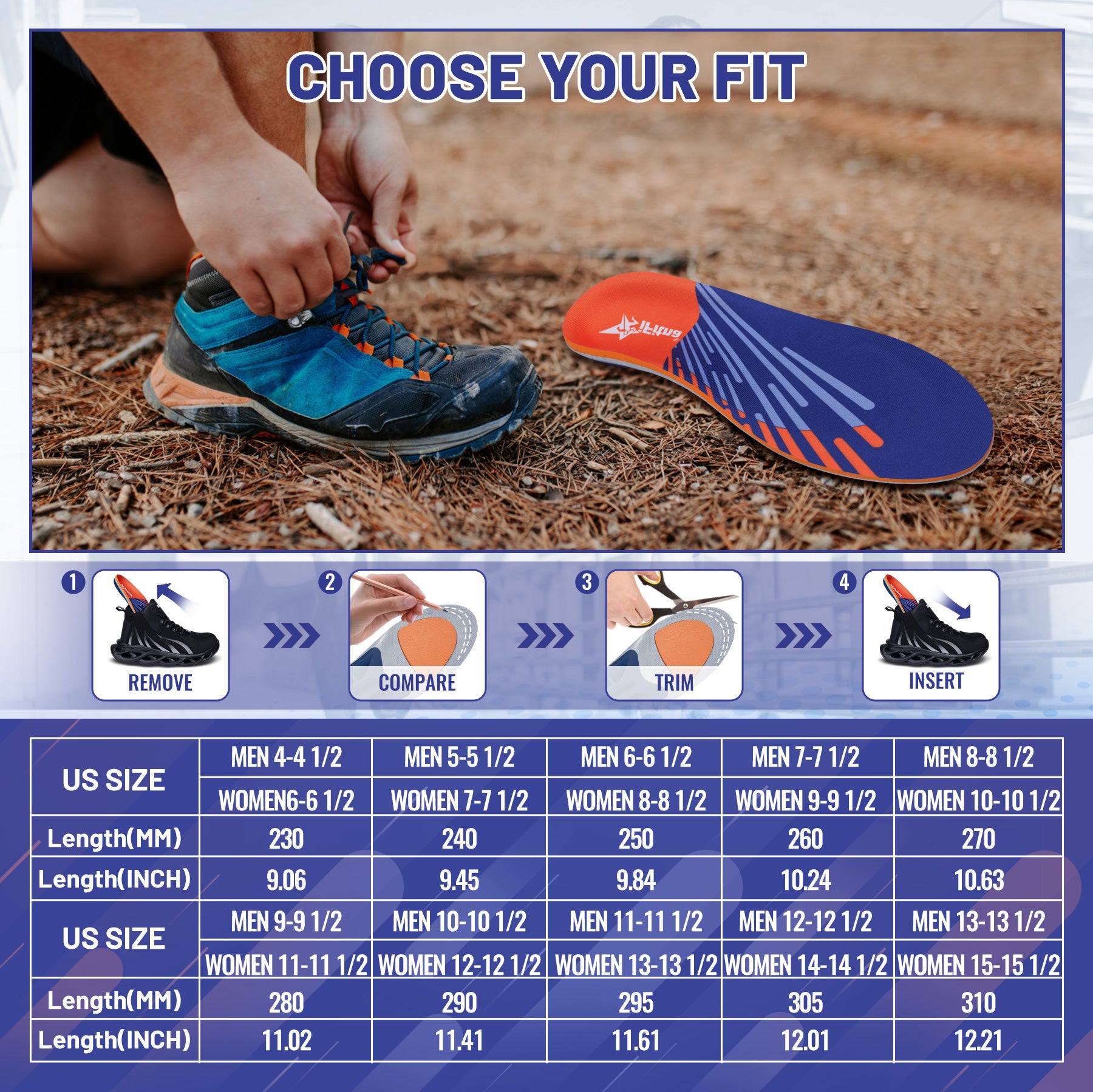 Adaptability: Fits various shoe types including sports shoes, work boots, and casual footwear; no trimming needed.